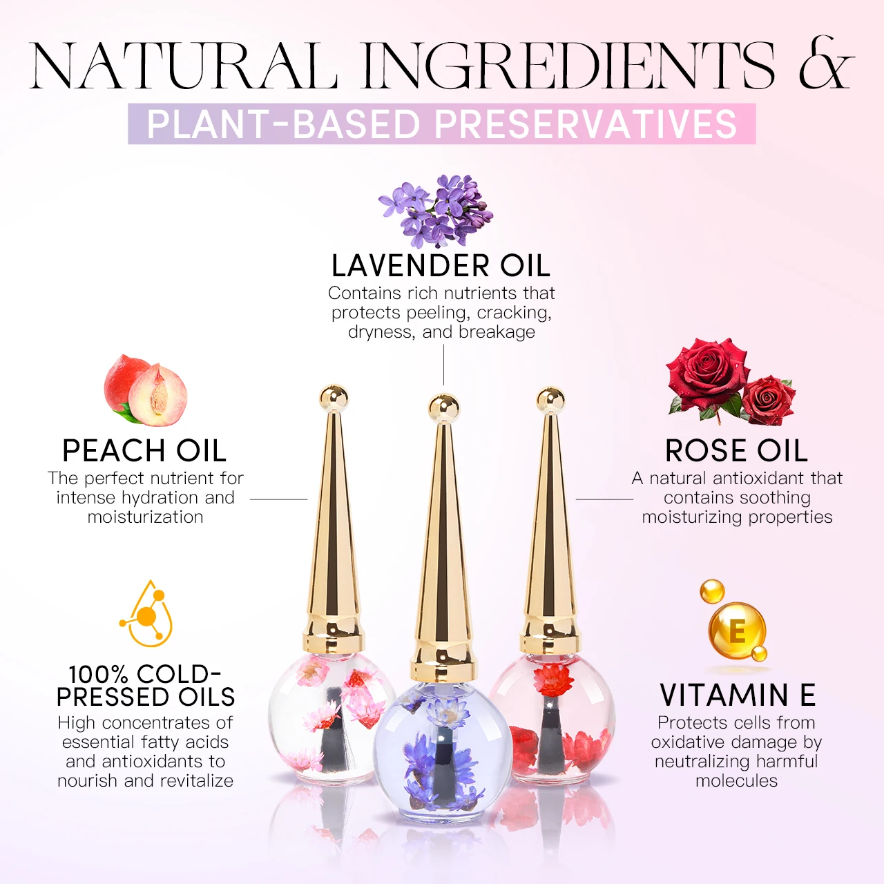 IDOL COLOR 15ml Cuticle Oil Nail Care Cuticle Vitamins Organic Nails Natural Oil Scented Cuticle Oil with Real Flowers The IDOL COLOR 15ml Cuticle Oil is a premium nail care product designed to nourish and hydrate your cuticles and nails. Infused with real dried flowers, each bottle offers a visually appealing and aromatic experience. Formulated with a blend of natural oils, including jojoba, sunflower, sweet almond, and avocado oils, along with vitamin E, this cuticle oil helps to soften dry, cracked cuticles and promote healthy nail growth.